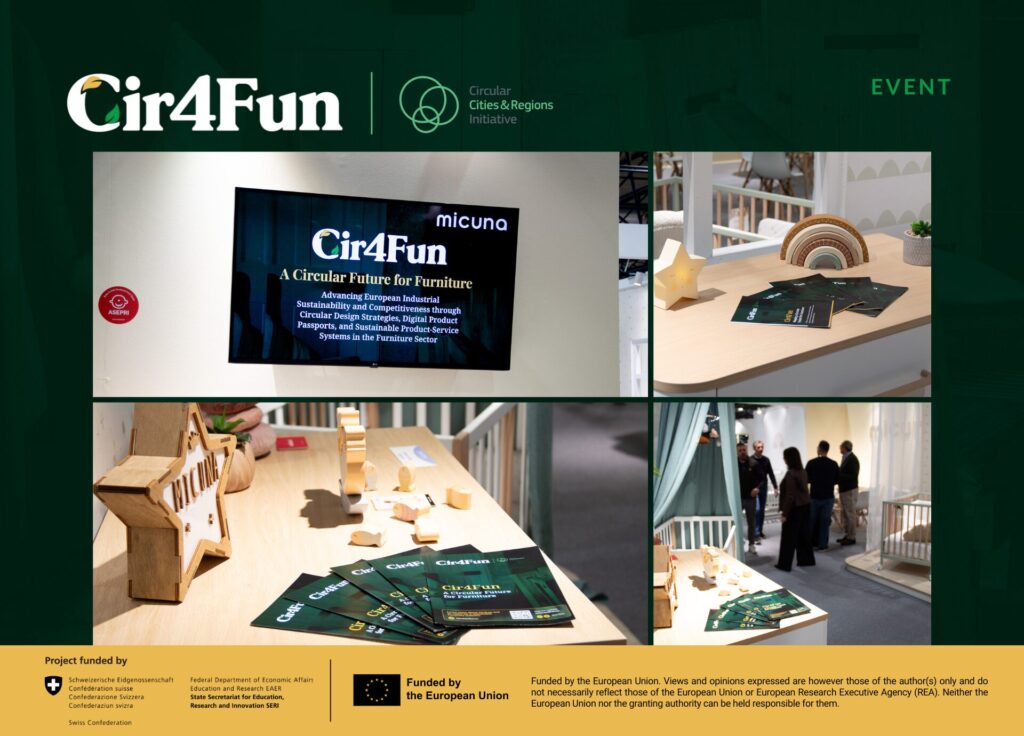 - In Person: Micuna represented Cir4Fun at their official stand, serving as a point of contact for the project during the event. This presence enabled direct conversations with industry professionals regarding the practicalities of circular manufacturing, specifically, the methods for producing furniture that is more durable and has a lower environmental footprint. It was an effective opportunity to demonstrate how project innovations translate into real-world industry settings.